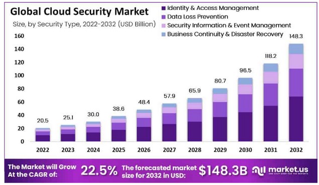到2032年,全球云安全市场规模预计将达到1483亿美元,2022年至2032年的复合年增长率将达到22.5%,而2022年云安全市场规模为205亿美元。