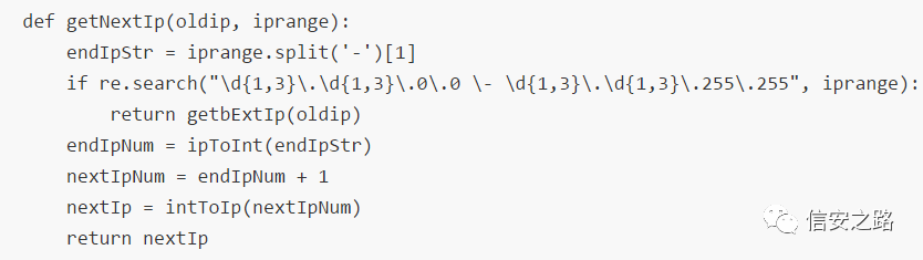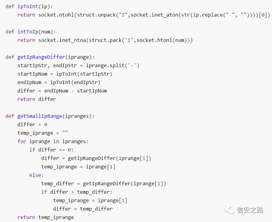 我写的这个还是比较粗糙的,写了一个简单的正则来匹配IP段,其实大家可以根据不同的whois服务器来使用不同的函数解析出IP地址。我们看到上面的代码中有一个函数_getSmallIpRange_,这个函数的由来,是因为有些IP的whois结果中会有两个所属IP段,为了获取的更加准确,所以就选择范围比较小的IP段作为下一次whois的参数。具体实现如下: