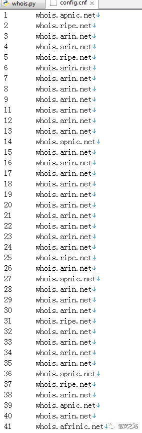 这里的内容是不同的A段所属的whois服务器,截取部分如图: