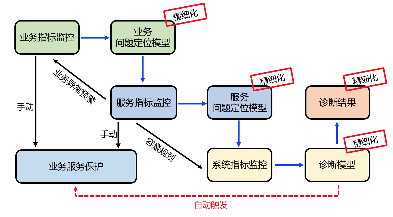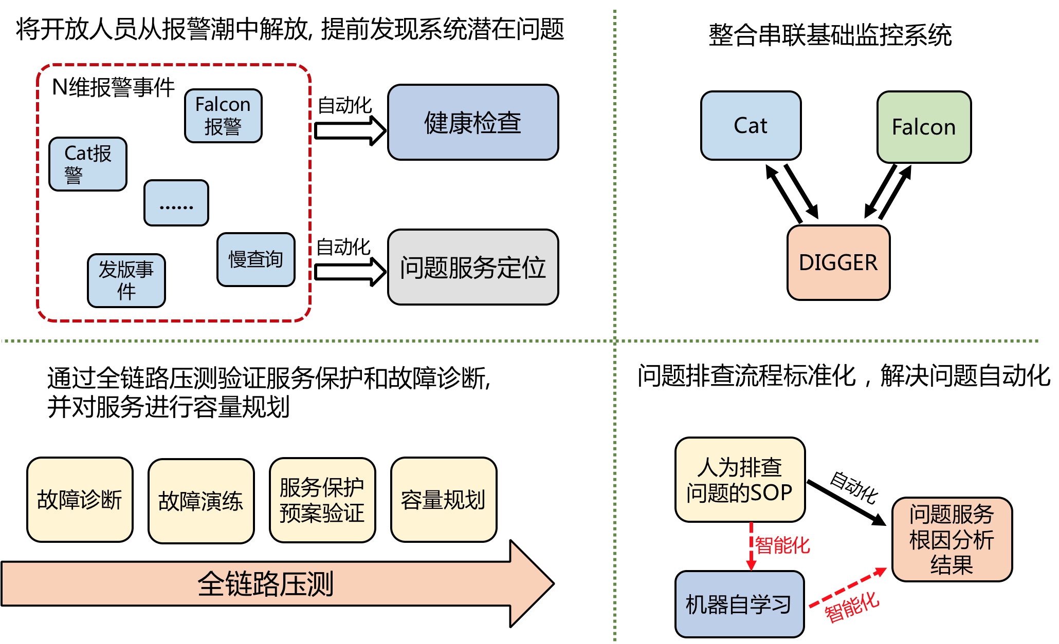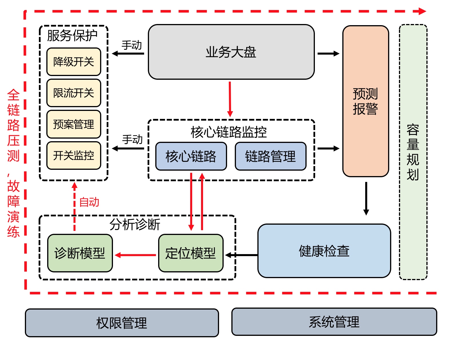 发现问题–>诊断问题–>解决问题,这个过程每一步都需要不断地提升准确度,具体数据可以通过全链路压测来获得,当某些场景准确度非常高的时候,就可以变为自动化方案。