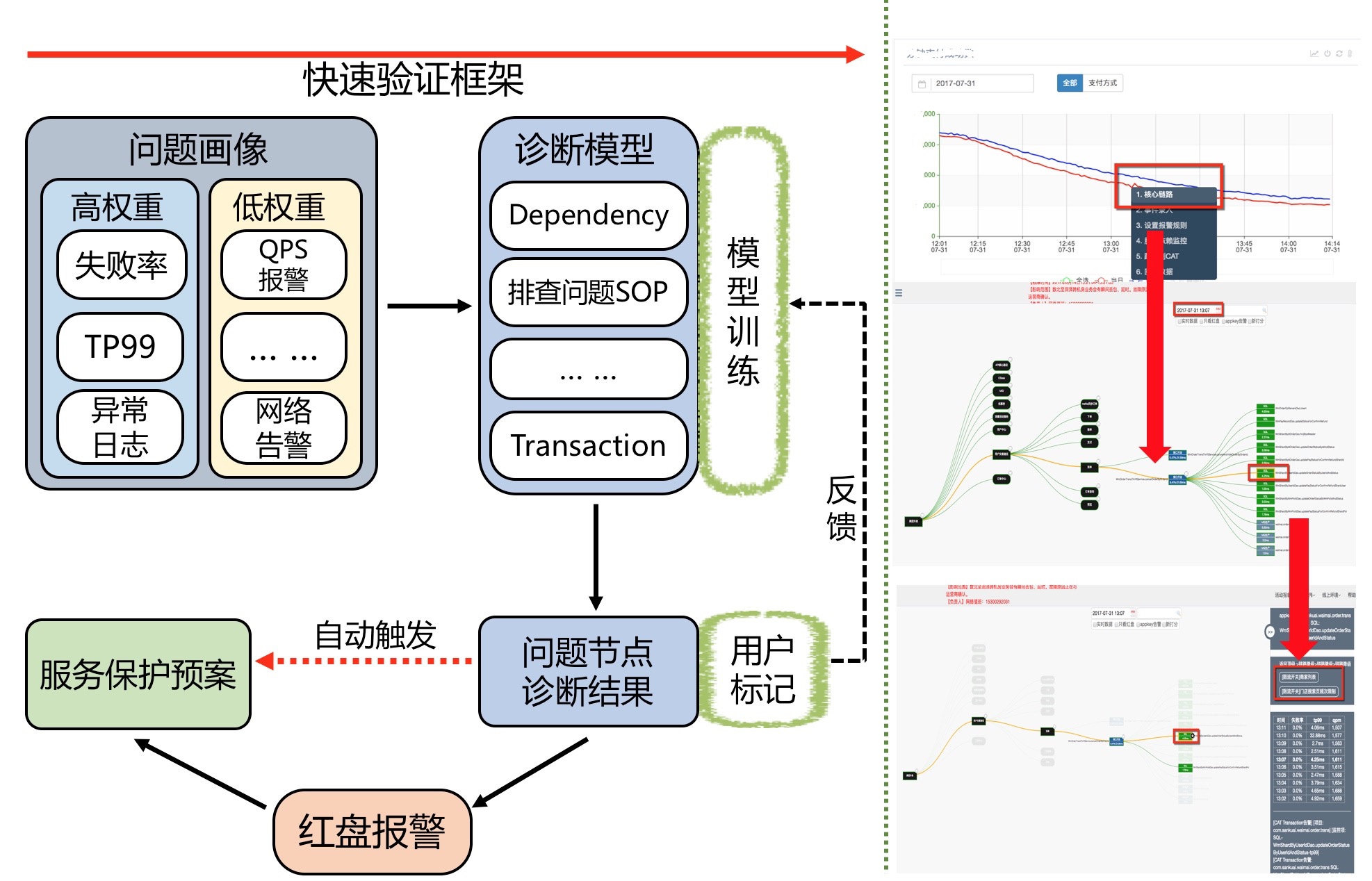 我们最终会发出问题诊断结果,这个结果在发出之后,还需要收集用户的反馈,判断诊断结果是否准确,为我们后续优化评分定位模型与诊断模型提供有力的数据支持。在核心链路建设前期,我们会建议开发人员进行相应的服务保护预案触发,当我们的诊断结果足够准确之后,可以针对固定问题场景自动化触发服务保护预案,以缩短解决问题的时间。