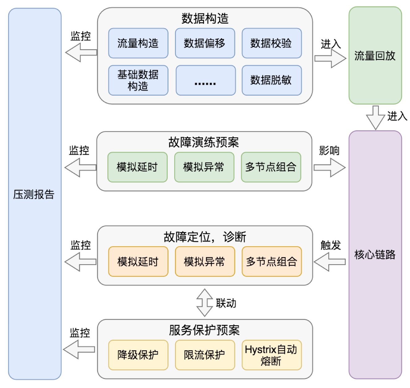 根据我们的运维经验,在出现生产事故时可能会涉及到多个开关的切换,这里就需要针对不同的故障场景预先设置服务保护预案,可以在出现问题时通过一键操作对多个服务保护开关进行预设状态的变更。我们既然有了应对不同故障场景的服务保护预案,就需要时不时来验证这些服务保护预案是否真的可以起到预期的效果。