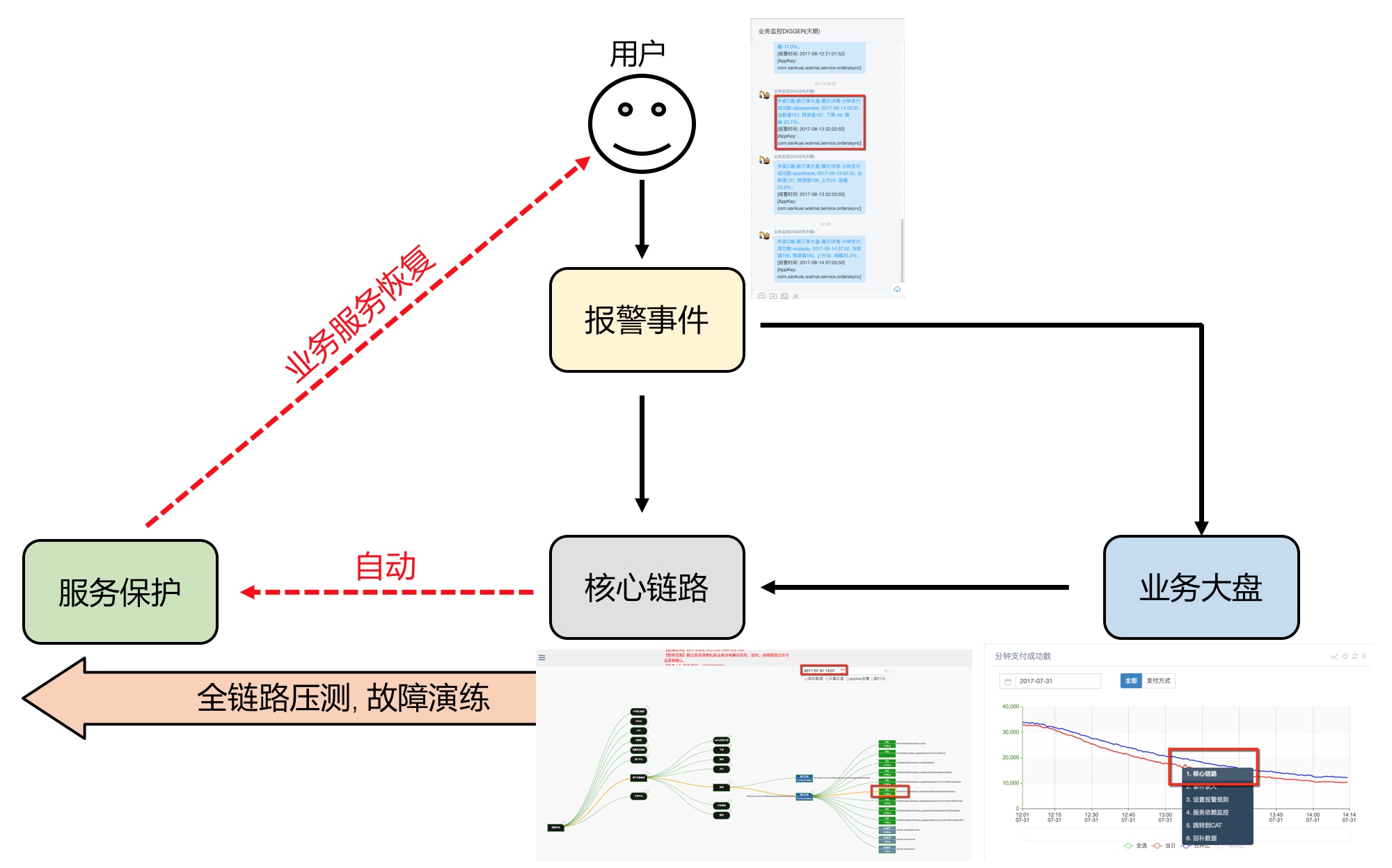 因此,我们的核心目标是,当整个方案可以自动化进行下去之后,对于用户来说的使用场景就变成了:收到异常报警->收到业务服务恢复通知。随着自动化方案越来越完备,开发人员可以更加关注业务逻辑的开发。