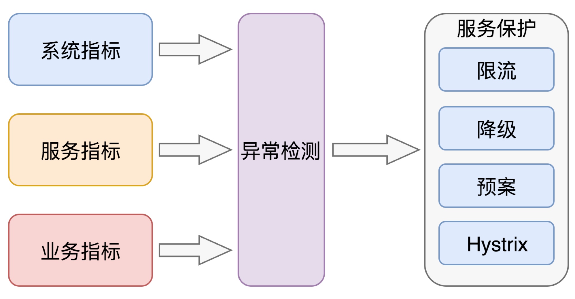我们的服务保护措施有一部分是通过Hystrix进行自动熔断,另外一部分是我们已经存在的上千个降级、限流开关,这部分开关平时需要开发人员根据自己的运维经验来手动触发。我们如果能够根据各种监控指标准确的诊断出异常点,并事先将已经确定的异常场景与我们的服务保护预案进行关联,就可以自动化的进行服务保护预案的触发,如图12所示。