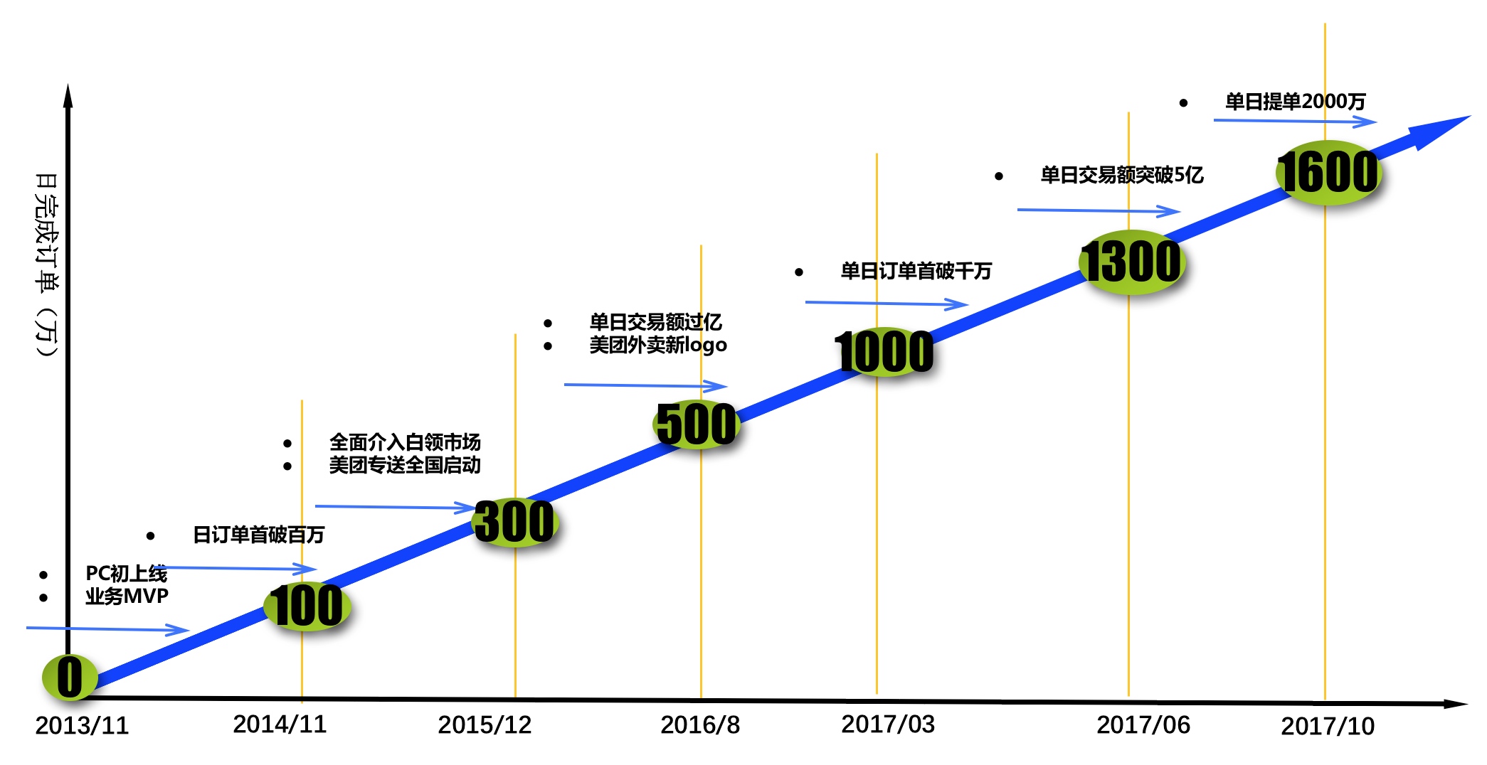 美团外卖自2013年上线至2017年10月份,在不到4年的时间里,日提单已达2000万,日完成订单突破1600万,如图3所示。这期间,业务产品一直处在高速迭代的过程中,某些数据访问的服务量会达到日均120亿+次,QPS近40万。现在如果在午高峰出现一个小小的事故,就会造成比较大的损失。