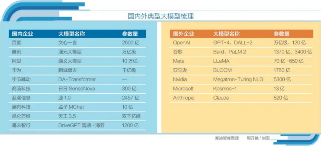 国内,产投研各方均已加快布局步伐。**一****是国内科技龙头企业密集发布自研大模型。**百度发布大模型文心一言,阿里发布首个超大规模语言模型通义千问,腾讯混元AI大模型团队推出了万亿级别中文NLP预训练模型HunYuan-NLP-1T。华为发布的鹏城盘古大模型是业界首个千亿级生成和理解中文NLP大模型。
