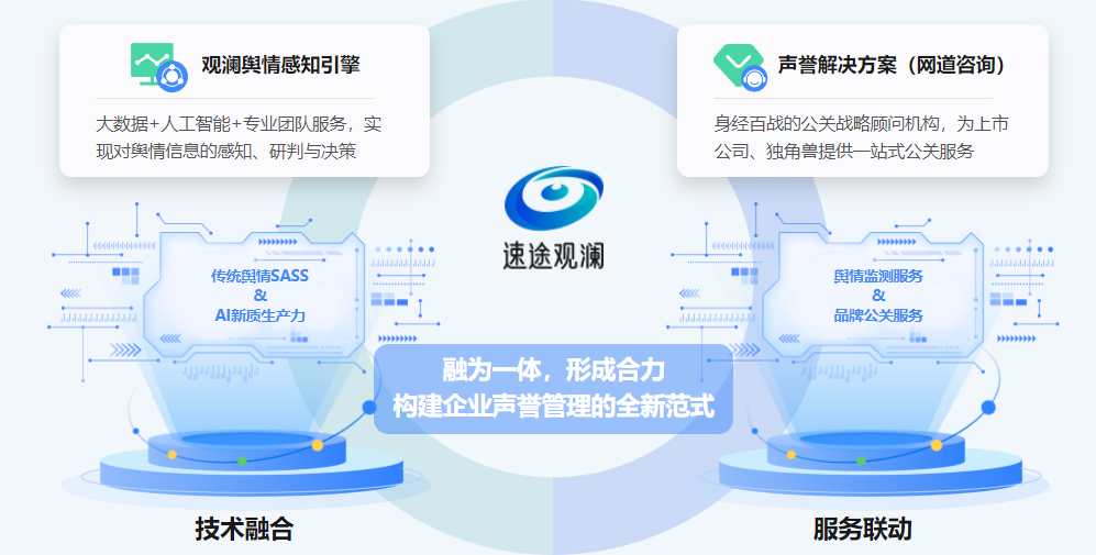 同时,**“**速途观澜”进一步深化拓展服务链条,同时融合了速途旗下身经百战的公关战略顾问机构“网道咨询”丰富的服务经验及能力,以AI赋能的精准感知为起点,通过智能分析与研判,为企业定制适配的公关预案。此外,同步提供公关策略咨询、媒体关系管理、舆论危机应对、IPO财经公关等一站式综合服务,将服务范围从舆情监测延伸扩展至更深层次的品牌声誉管理服务领域,为企业构建全方位的品牌生态。