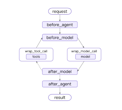 LangChain v1.0引入中间件Middleware后,智能体调用流程变更如下: