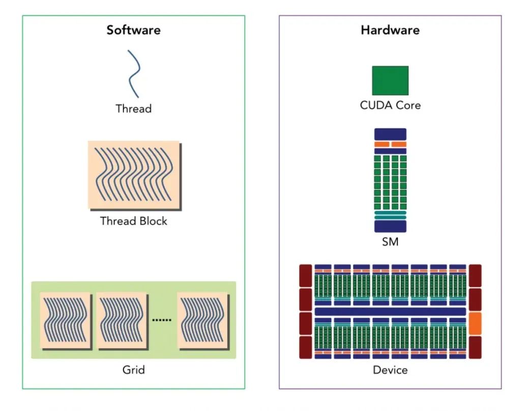 CUDA 将并行任务分解为多个线程(Thread),再组织为线程块(Block)和网格(Grid),这是CUDA程序的核心执行模型。