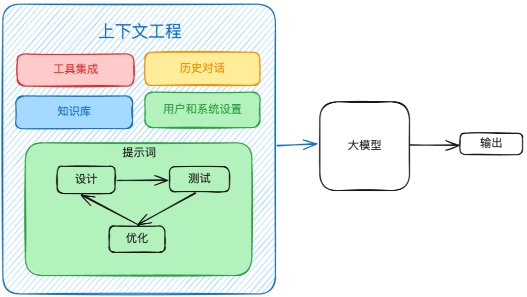 所以,大模型根本不关心你是怎么检索的,大模型关心的是你怎么把检索到的结果给到模型。简单来说其实就是,把问题,参考文档,历史记录等一块拼接到提示词中,然后丢给模型,而这就是模型的上下文管理。