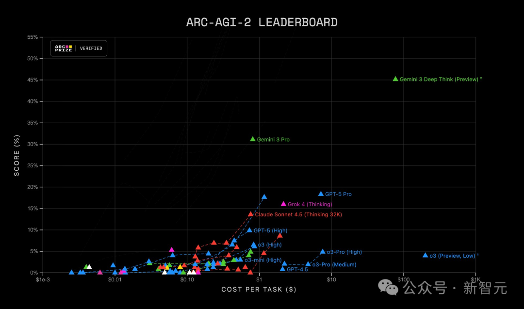 而且,更在ARC-AGI-2(带代码执行,ARC Prize Verified)中创下45.1%历史新高,一展应对未知与新颖问题的强大能力。