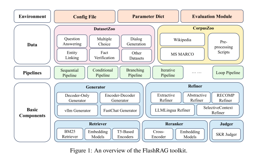 - 工具包结构:FlashRAG的结构包括环境模块、组件模块和管道模块,这种分层模块化设计使得研究人员可以轻松地组装和执行完整的RAG过程。