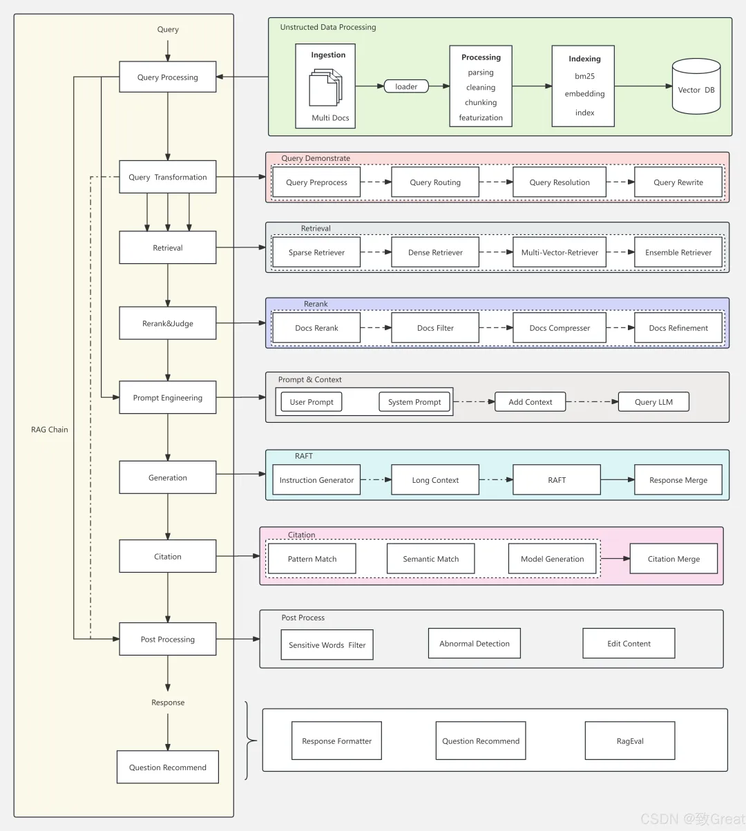 - 后检索(Post-retrieval):对检索到的文本块进行重排、压缩和选择,以优化上下文信息的利用。