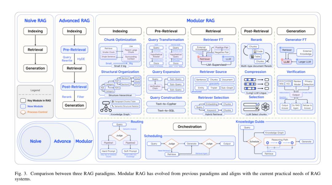 图4:RAG三种范式的比较。(左)朴素RAG主要由三部分组成:索引、检索和生成。(中)高级RAG围绕检索前和检索后提出了多种优化策略,其过程与朴素RAG相似,仍然遵循链状结构。(右)模块化RAG继承和发展了以前的范式,整体上展示了更大的灵活性。这在引入多个特定功能模块和替换现有模块方面表现得很明显。整个过程并不局限于顺序检索和生成;它包括迭代和自适应检索等方法。[2]