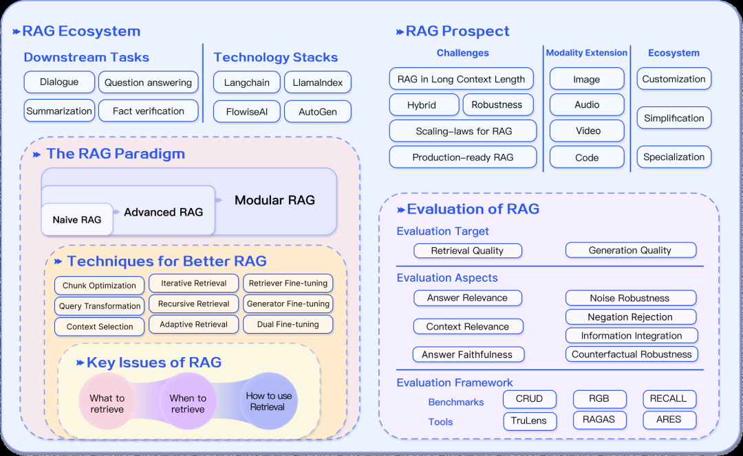 图2:RAG研究技术树。涉及RAG的阶段主要包括预训练、微调和推理。随着LLMs的出现,对RAG的研究最初侧重于利用LLMs强大的上下文学习能力,主要集中在推理阶段。随后的研究更加深入,逐渐与LLMs的微调相结合。研究人员也一直在探索通过检索增强技术在预训练阶段增强语言模型的方法。[3]