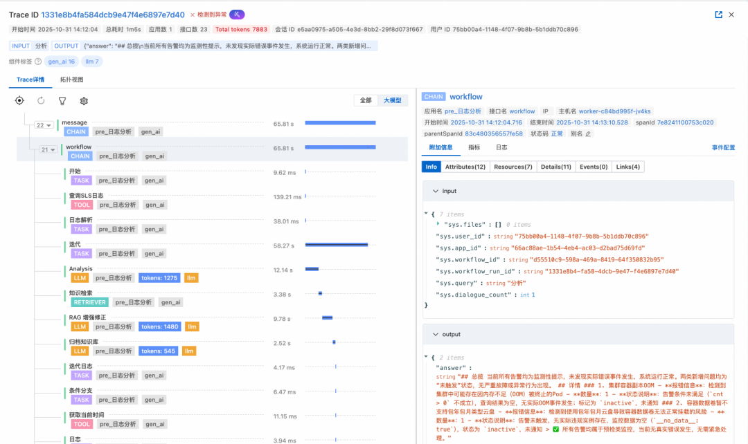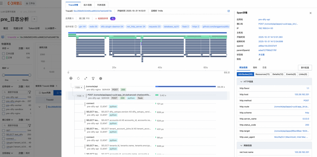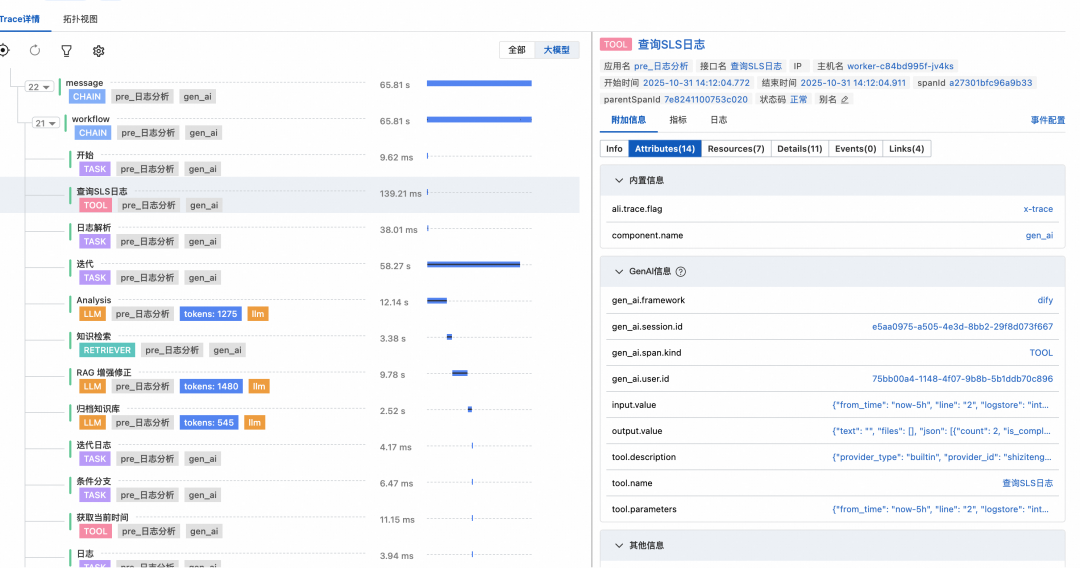 如图示例中“查询SLS日志”是一个 Dify 插件,正常调用只需 200 ms,但在这个 Trace 中却有 5 s多的慢调用。仅看 LLM Trace 或 Dify 执行日志,无法判断慢请求是因为 Dify-Api 引擎、Dify-Plugin-Daemon 插件引擎、Dify-Plugin 运行时或者 SLS 日志服务本身导致的。