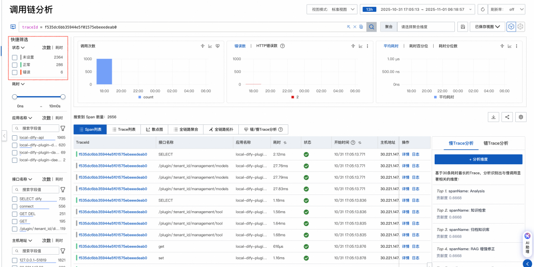 可以看到 dify 执行引擎(local-dify-api)发起了对 dify 插件引擎(local-dify-plugin-daemon)的POST 调用,插件引擎调用插件运行时(local-dify-plugin-daemon_plugin_cms_0.0.1)并转发请求给 SLS 服务端口。整个链路上耗时最长的是 dify_plugin_execute,这是插件运行时内部的入口方法,我们正是在此处注入了故障模拟的慢调用。