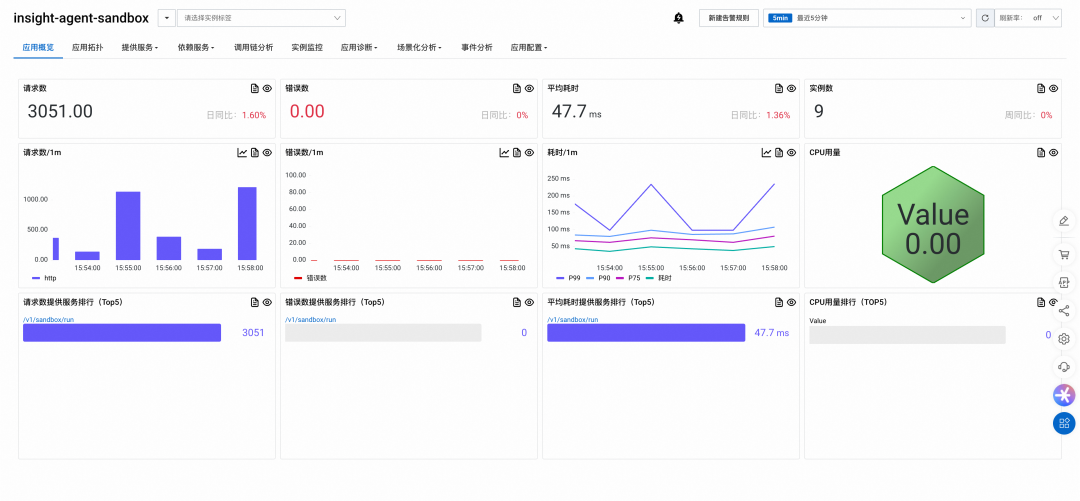 云监控为执行引擎、插件运行 提供 Python 探针,通过函数 Patch 实现零代码改动的无侵入埋点;为插件引擎和代码沙箱提供 Go 探针,通过编译时插桩实现无侵入注入;为 Nginx 和 Celery 任务队列提供 OTel 探针的解决方案;对于生命周期受插件引擎管控的插件运行时,通过代码插桩改造插件拉起流程,引入探针挂载逻辑。最终对 Dify 集群内的各个组件,只需配置环境变量并修改启动命令即可实现无侵入注入。