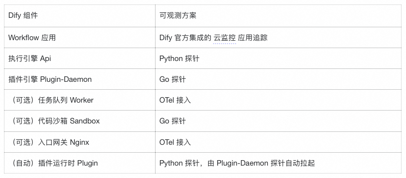 云监控给 Dify 的各个组件都提供了可观测方案,其中 Workflow 应用无需挂载探针,在 Dify 控制台上为需要监控的应用开启追踪即可。其余组件需要挂载探针实现监控,其中 API 和 Plugin-Daemon 是核心的工作流和插件系统执行引擎,推荐优先挂载。 Sandbox、Worker、Nginx 按需可选挂载。
