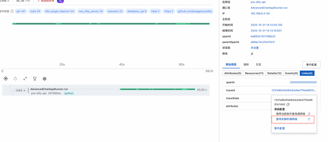 点击“查询关联的调用链”,可以直接跳转到关联的基础设施 Trace: