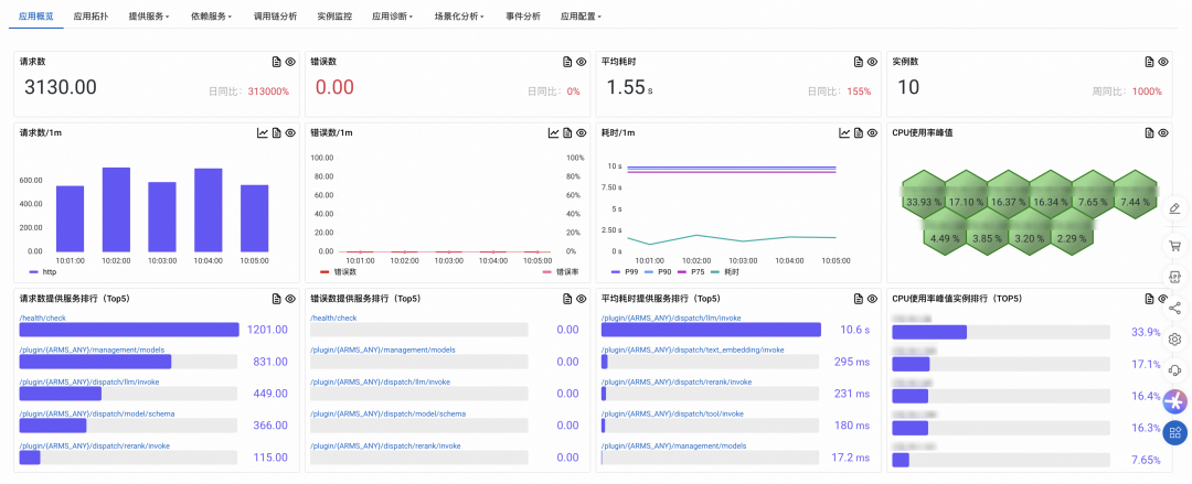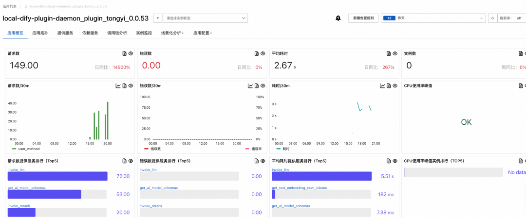 Dify 社区提供了丰富的插件生态,但管理插件的 Dify-Plugin-Daemon 和插件运行时却是难以定位故障的黑盒。在 Dify 控制台上能清晰地看到各个工作流节点的运行记录,但对于流程节点之下 Dify infra 设施的故障却无从分析。一次 Workflow 调用链路涉及 Nginx、Api、Plugin-Daemon、Plugin 运行时和模型网关等多个组件,阿里云云监控提供的全链路追踪能力可以串联上下游的完整链路,定位插件内的错慢异常。