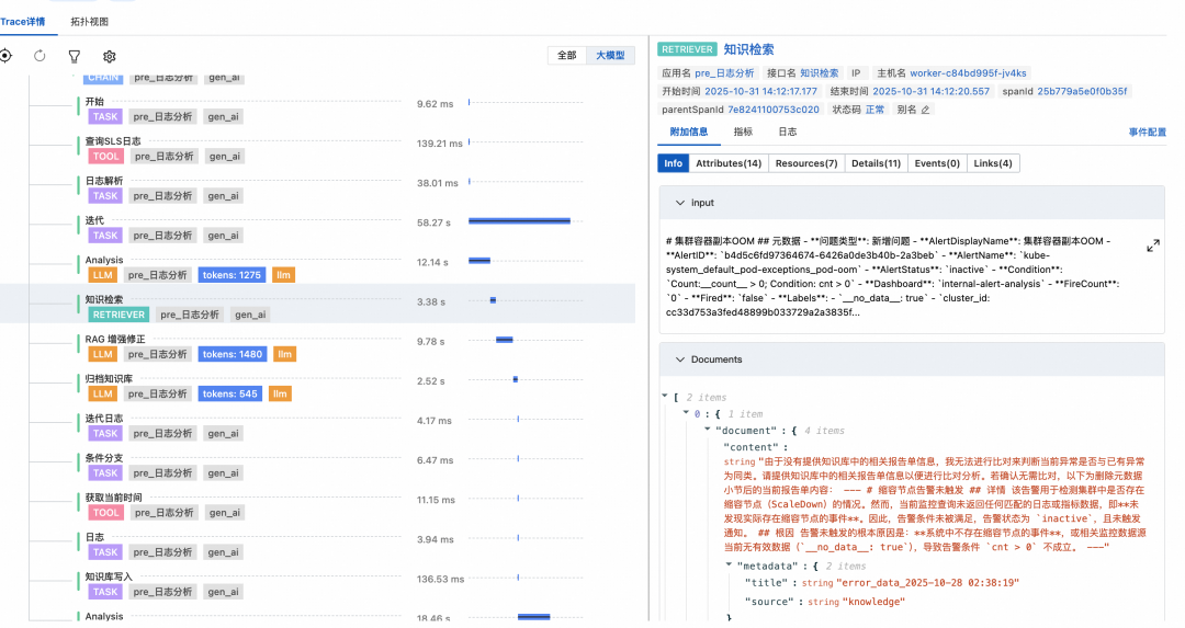Retriever 节点会采集 查询语句、召回片段、关联文档元数据、embbeding 评分等信息。