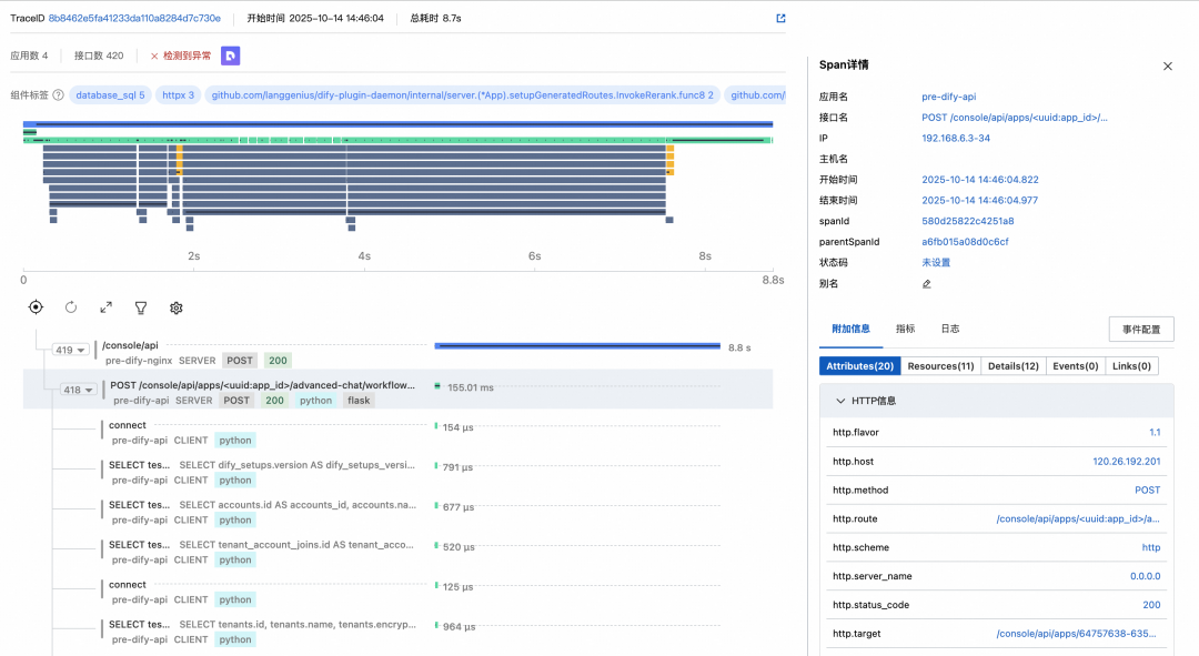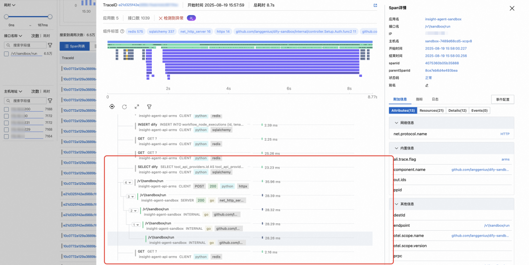 工作流层面的异常通常在 LLM Trace 或 Dify 日志追踪里可以看到直观的报错信息,但还有一类错误是底层 Dify 引擎的配置不当或内部 bug 引起的。无侵入探针提供了对这类错误的定位分析能力。