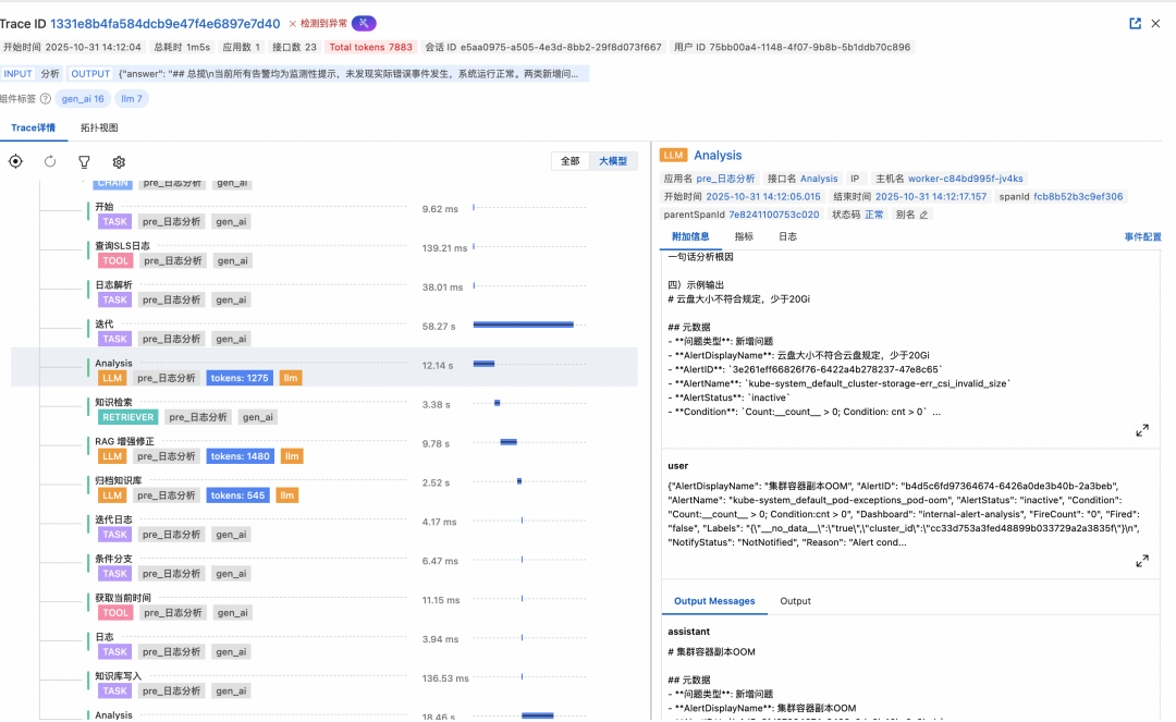 此时,可以根据 Dify 对话ID、用户ID 等信息在云监控上定位对应的 LLM Trace: