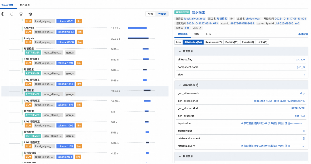进入会话详情,找到对应 Trace 和相关 Span,首先尝试在 Span 详情中查找相关信息: