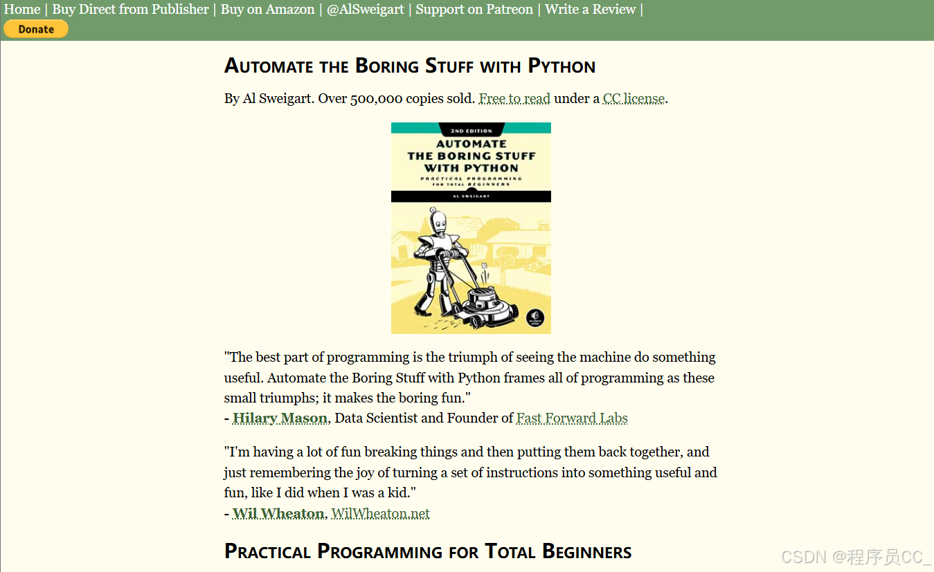 以自动化任务为核心的免费在线书籍,教授如何用Python处理Excel、PDF、邮件等日常办公场景。适合希望通过实际案例提升编程兴趣的学习者。