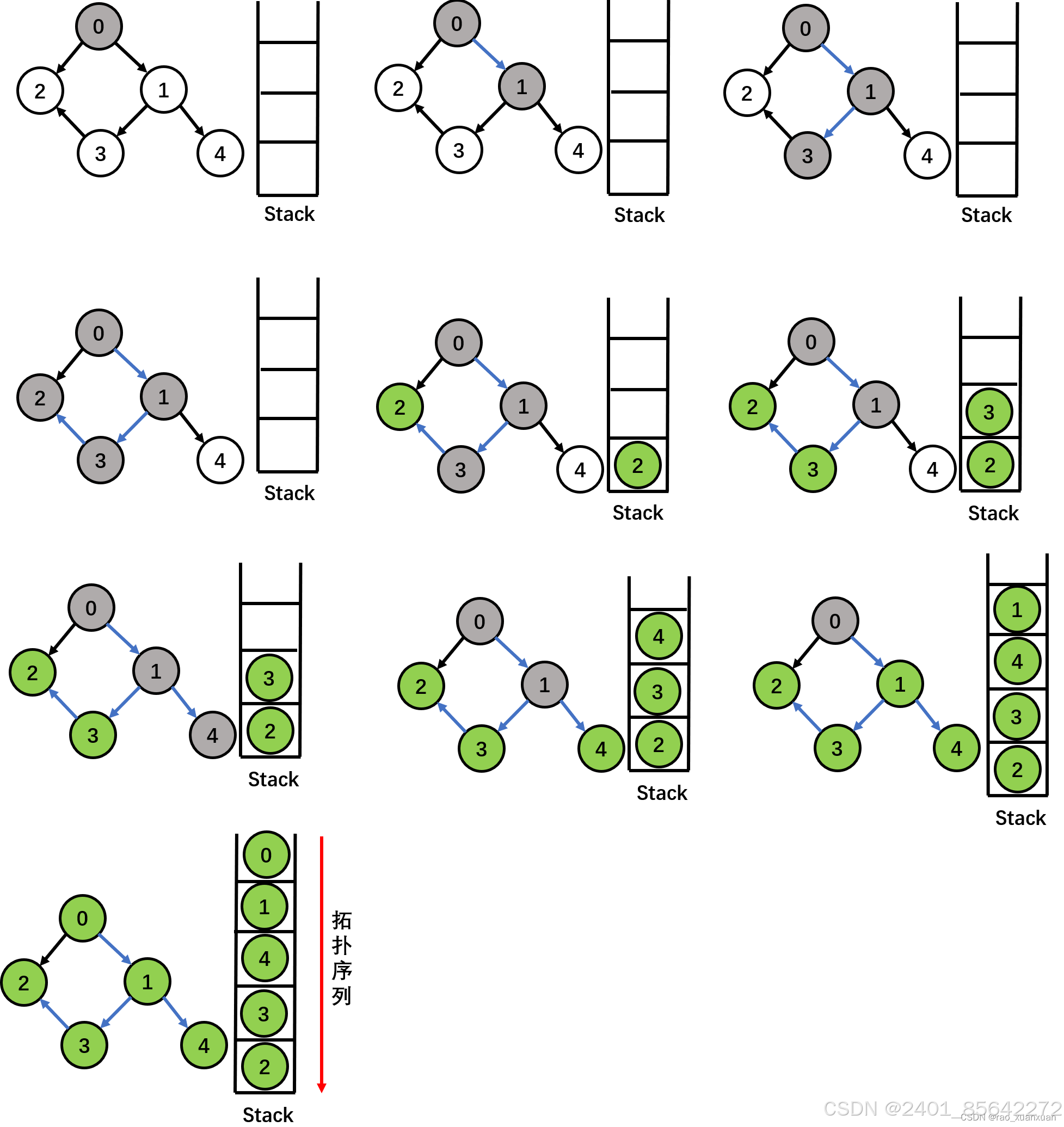 - 对于同一个图,可能存在多个合法的拓扑排序序列。