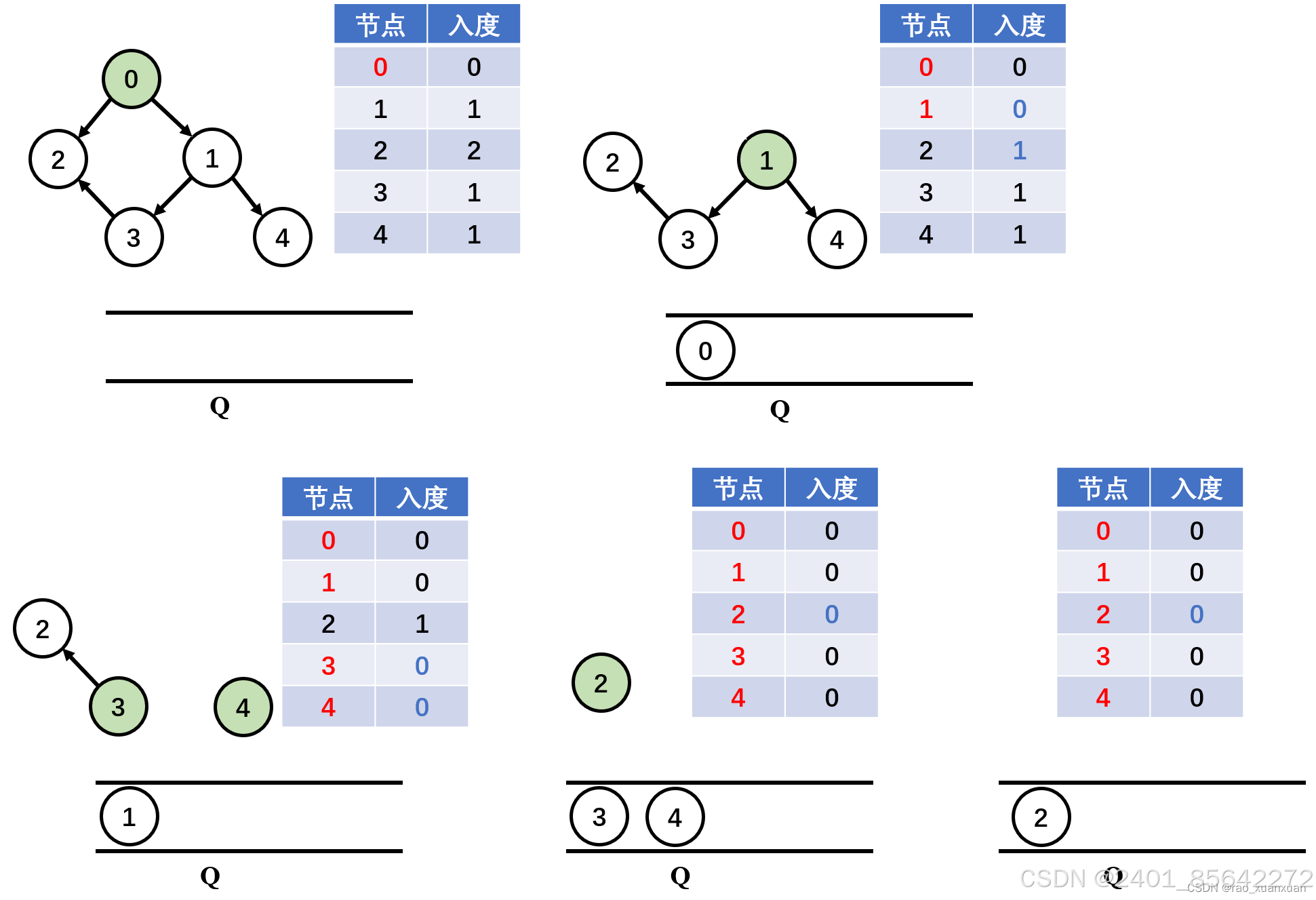 3、重复上述步骤,直到所有的顶点均已输出,或者当图中不存在无前驱的顶点为止