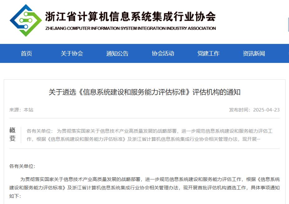 为贯彻落实国家关于信息技术产业高质量发展的战略部署,进一步规范信息系统建设和服务能力评估工作,根据《信息系统建设和服务能力评估标准》及浙江省计算机信息系统集成行业协会相关管理办法,现开展首批评估机构遴选工作,具体事项通知如下: