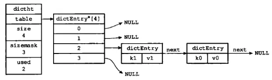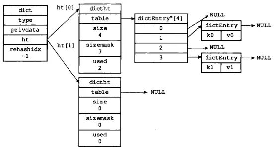 字典ht[2]是一个包含两个哈希表的数组,一般情况下只使用ht[0],只有在rehash时会使用ht[1]。dict.rehashidx记录目前rehash进度。