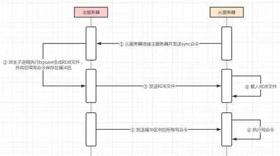 - 主服务器收到sync命令,派生一个子进程执行bgsave生成一个RDB文件,并使用一个缓冲区记录从现在开始执行的所有写命令;