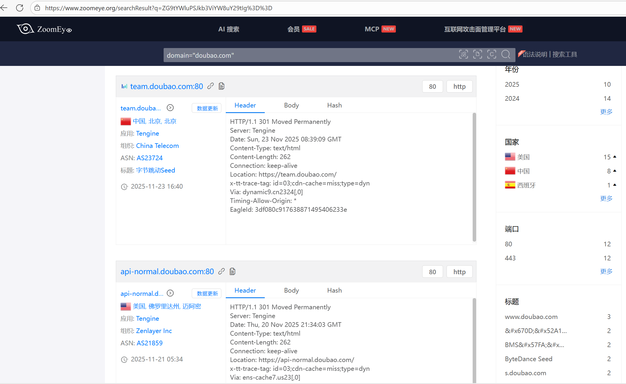 搜索框中使用了domain="doubao.com"语法,目的是收集 “doubao.com” 主域名下的所有关联资产(包括子域名、关联 IP 等),属于 “子域名 / 企业资产梳理” 的典型场景。