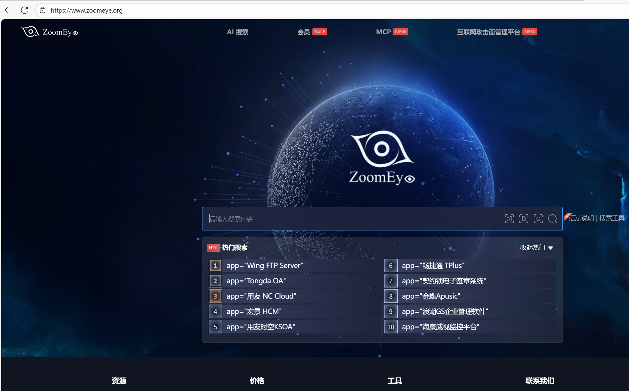简要介绍:ZoomEye是知道创宇旗下 404 实验室打造的全球知名网络空间搜索引擎,也是国内首款该类型搜索引擎,ZoomEye属于“网络空间测绘”或者“网络空间搜索引擎”,它的特点是能够搜索到互联网上暴露的设备和服务器。主要用于网络侦查,漏洞发现以及网络安全的研究,在网络安全领域有着重要的应用价值