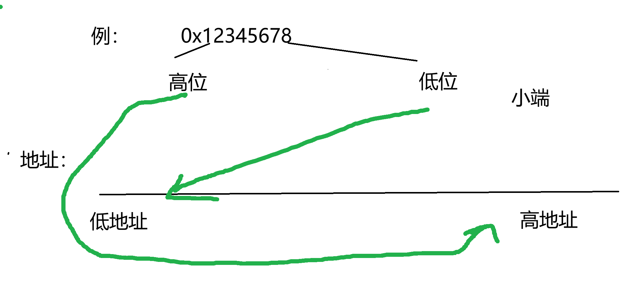 ⼩端(存储)模式: 是 指数据的低位字节内容保存在内存的低地址处,⽽数据的⾼位字节内容,保存在内存的⾼地址处。