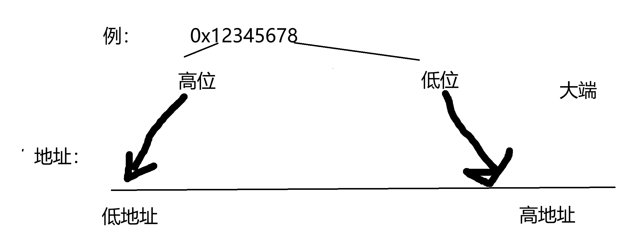 ⼤端(存储)模式: 是 指数据的低位字节内容保存在内存的⾼地址处,⽽数据的⾼位字节内容,保存在内存的低地址处。