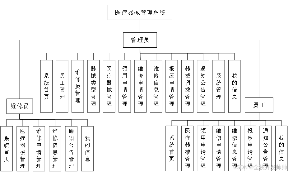 本系统使用的数据库为MySQL数据库,选择该数据库的原因是因为该数据库开源、免费,且相对简便,且由于使用人数众多,在处理问题上会得到更多已知的帮助。本系统作为一个医疗器械管理系统,其体量并不会很大,也很适合MySQL数据库的特点。综上所述,本项目采用MySQL作为本项目的数据库和进行数据表的设计。如图4-4是该系统软件的总体功能结构图: