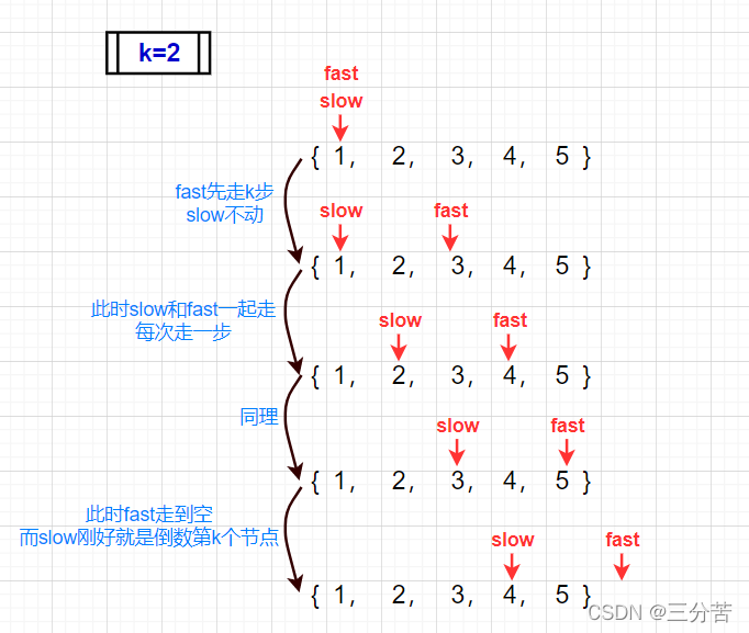 定义两个指针slow和fast,让fast先走k步,再让slow和fast同时走,当fast走到尾部时,slow就是倒数第k个,因为这样的话slow和fast的差距始终是k个,当fast走到空时结束。此题同样可以走k-1步,不过当fast走到尾部时结束,也就是fast的下一个节点指向空时结束,都一样。先拿走k步举例,如图所示: