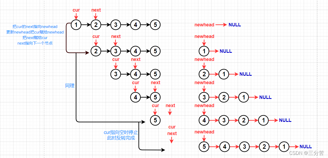 此法就需要再创建一个链表了,创建一个新的头部newhead指向NULL,再定义一个指针cur指向原链表第一个数据,注意还得定义一个指针next指向cur的下一个节点。遍历原链表,把节点取下来头插到newhead所在的链表。每次更新newhead赋给cur,如图所示: