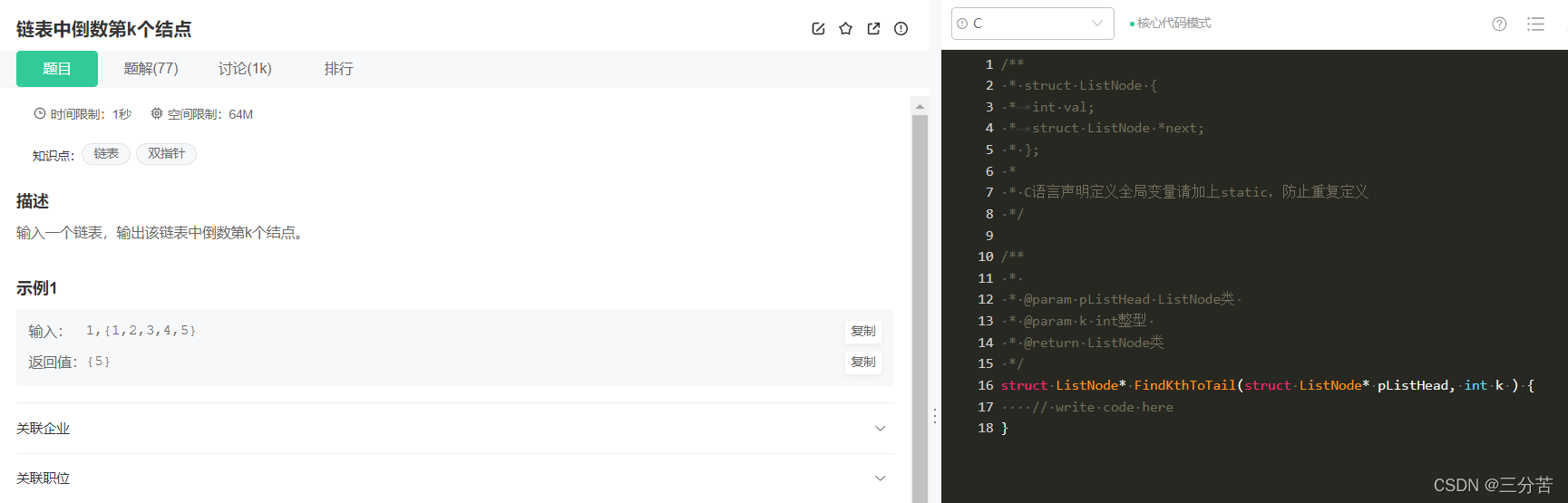 struct ListNode* FindKthToTail(struct ListNode* pListHead, int k ) { // write code here struct ListNode*fast=pListHead; struct ListNode*slow=pListHead; while(k--) { //if判断,防止k大于链表的长度 if(fast==NULL) return NULL; fast=fast->next; } while(fast) { fast=fast->next; slow=slow->next; } return slow; }