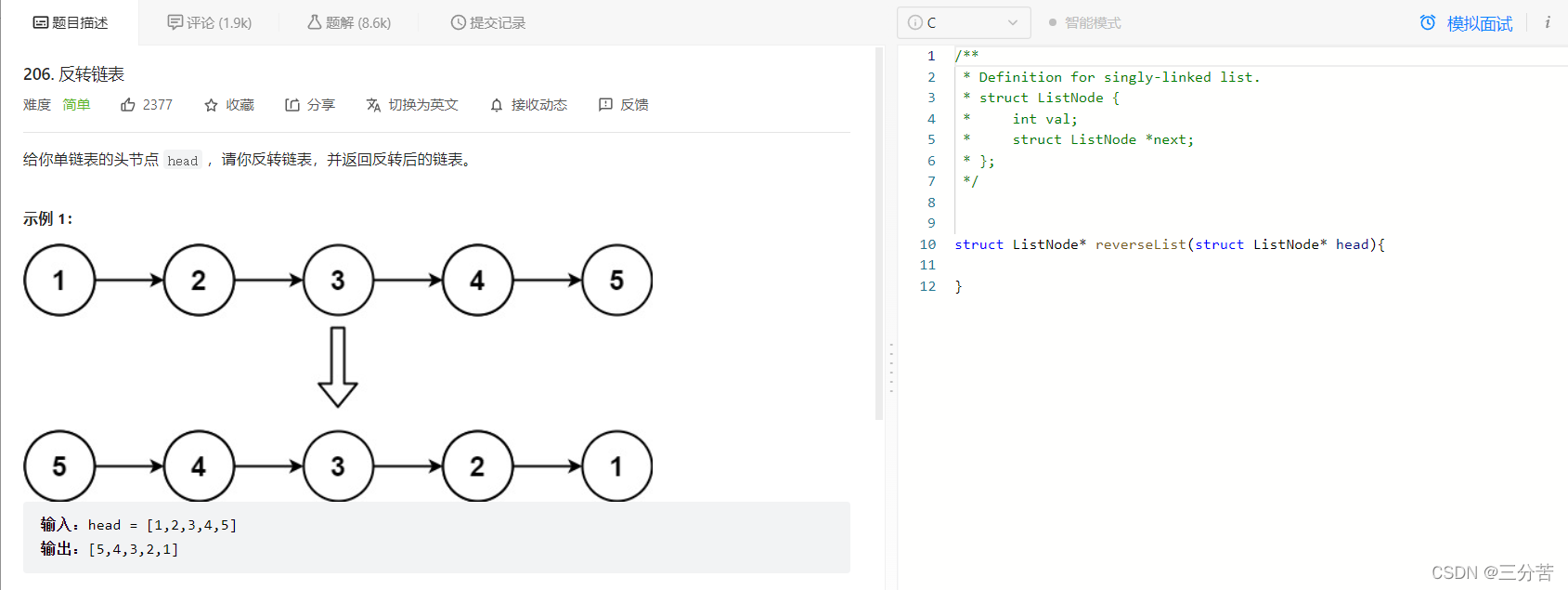 struct ListNode* reverseList(struct ListNode* head){ if(head==NULL) { return NULL; } struct ListNode*n1=NULL; struct ListNode*n2=head; struct ListNode*n3=n2->next; while(n2) { n2->next=n1; n1=n2; n2=n3; if(n3) { n3=n3->next; } } return n1; }**法二:**头插