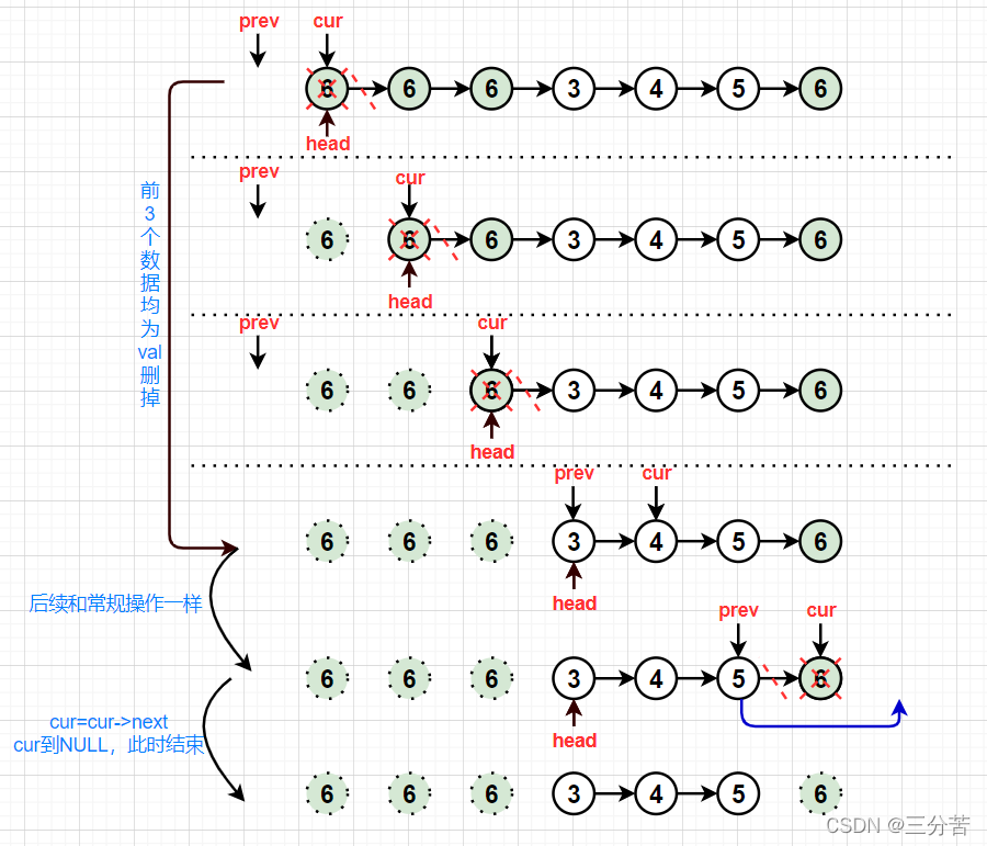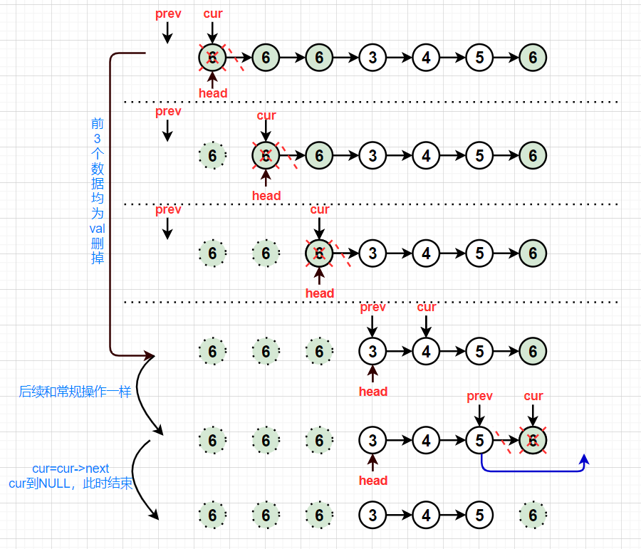 此时除了刚才定义的两个指针prev和cur外,还要有个head指向头部,当头部是val时,将cur指向下一个位置,head跟着一起动,直到cur指向的数据不为val时,将head赋给prev。此时剩余的就按常规处理即可。