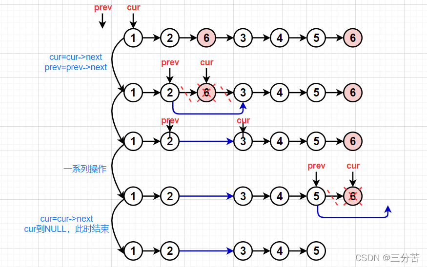 需要定义两个指针prev和cur,cur指向第一个数据,prev指向cur的前一个。依次遍历cur指向的数据是否为val,若是,则把prev的下一个节点指向cur的下一个节点上,cur=cur->next,prev跟着cur一起走,直到cur走到NULL