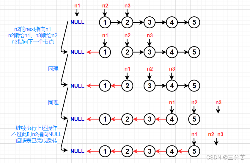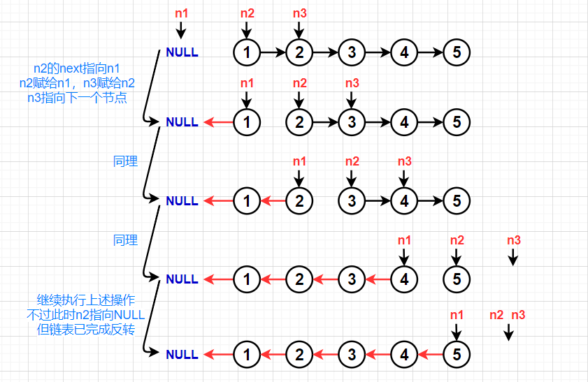定义三个指针n1,n2,n3分别用来指向NULL,第一个数据,第二个数据。让n2的next指向n1,把n2赋给n1,再把n3赋给n2,再执行n3=n3->next的操作,接下来重复上述操作,直到n2指向空即可。但是要注意,要先判断该链表是否为NULL,如果是,则返回NULL,此外,还要保证当n3为空时就不要动了,直接把n3赋给n2即可。