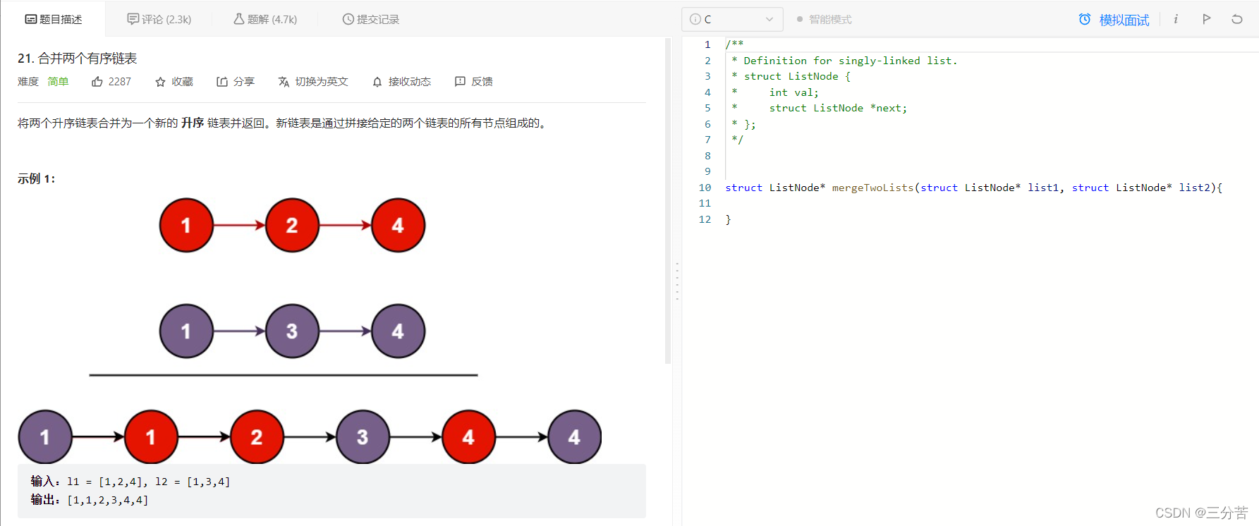 struct ListNode* mergeTwoLists(struct ListNode* list1, struct ListNode* list2) { struct ListNode* head = NULL, * tail = NULL; head = tail = (struct ListNode*)malloc(sizeof(struct ListNode)); head->next = NULL; while (list1 && list2)
