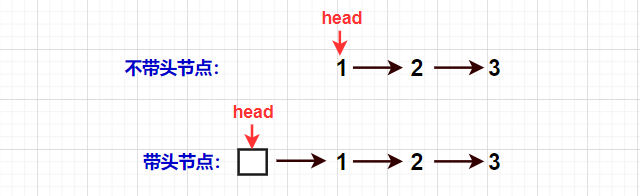 比如说同样一个链表存1,2,3。不带头节点只有这三个节点,head指向1。而带头节点的同样存3个值,不过有4个节点,head指向头部这个节点,这个节点不存储有效数据