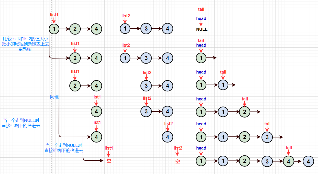 假设新链表的头叫head并指向NULL,还需要定义一个指针tail来方便后续的找尾,依次比较list1和list2节点的值,把小的放到新链表head上,并更新tail,再把list1或list2更新一下。当list1和list2两个链表中一个走到空时,直接把剩下的链表所有剩下的元素拷进去即可